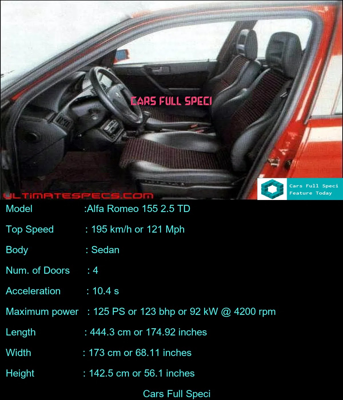 Now, see the Size, Dimensions, Aerodynamics, and Weight details about the Alfa Romeo 155 2.5 TD. the overall details about the car is Sedan . Alfa Romeo 155 2.5 TD have 4 doors. The horizontal distance between the front and rear axles of a road is 254 cm or 100 inches .The length of the car is 444.3 cm or 174.92 inches , width is 173 cm or 68.11 inches and the height is height. it have 5 seats. The measure of the effectiveness of a streamlined aerodynamic body shape in reducing the air resistance to the forward motion 0.29 Front and rear Break discs dimensions are Vented Discs (257 mm) , Discs (- mm) also the front and rear tyres rims dimensions are 205/50 R15 , 205/50 R15 . The weight of the car with all of the standard equipment and amenities, but without any passengers, cargo or any other separately loaded items is 1340 kg OR 2954 lbs . space to keep our luggage(Boot space) is 525 L . details of front suspension is McPherson struts coil springs and anti-roll bar and rear suspension is Trailing arms coil springs and anti-roll bar .